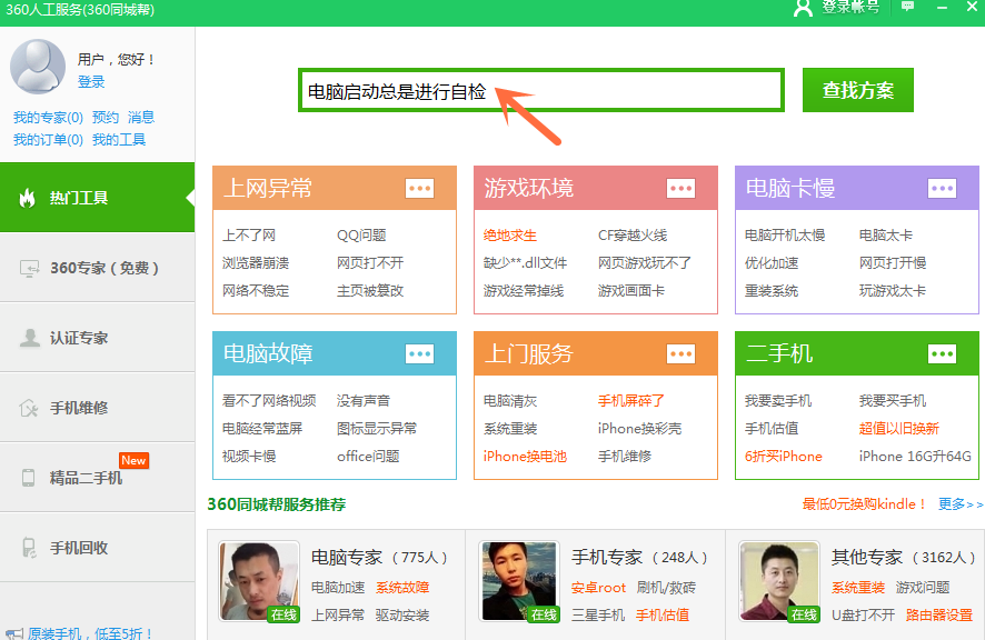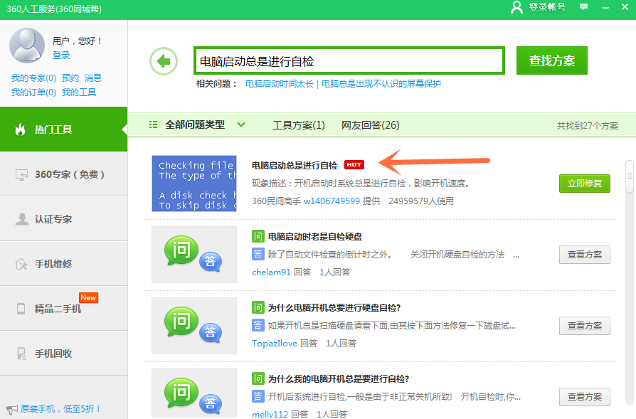 2、進去人工服務(wù)界面之后,在搜索框中輸入“電腦啟動總是進行自檢”,點擊查找方案,如下圖所示: