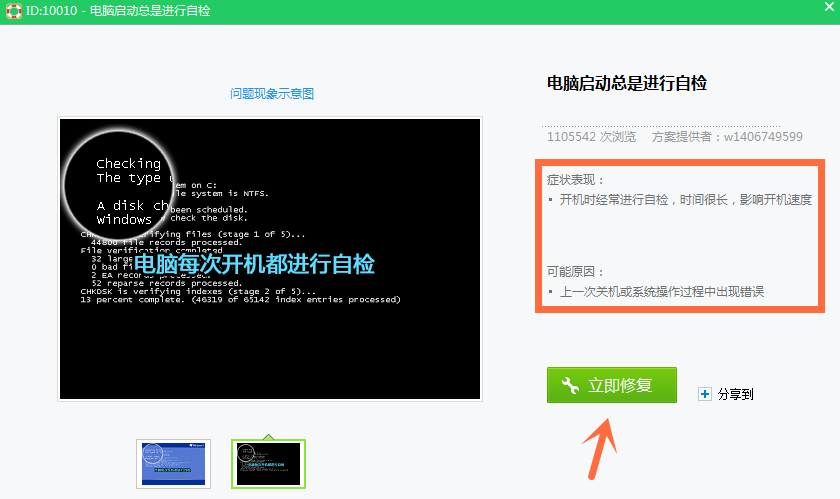 3、我們可以看到已經(jīng)找到了電腦啟動總是進行自檢的修復(fù)方案,先點擊一下問題圖標(biāo),查看產(chǎn)生的原因,如下圖所示: