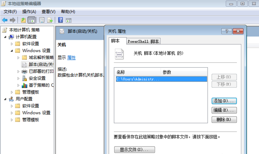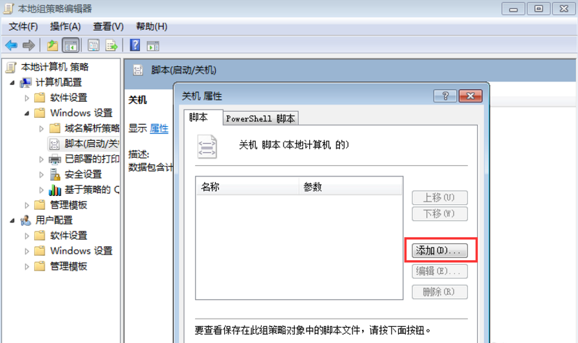 6、雙擊關(guān)機腳本,在關(guān)機腳本屬性中,點擊添加,