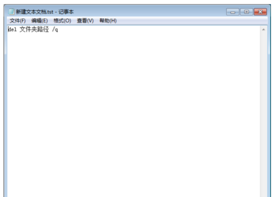 2、打開這個新建的記事本,輸入 del 文件夾路徑 /q ,并保存,