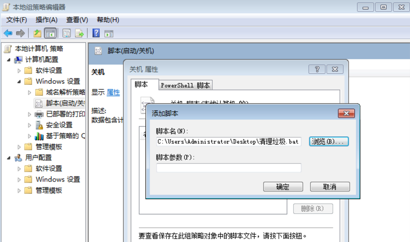 7、點擊瀏覽,把剛新建的bat文件添加進(jìn)來,腳本參數(shù)空白即可,然后點擊確定,再次點擊確定,這樣就創(chuàng)建完成了,電腦在關(guān)機時就會自動清理!