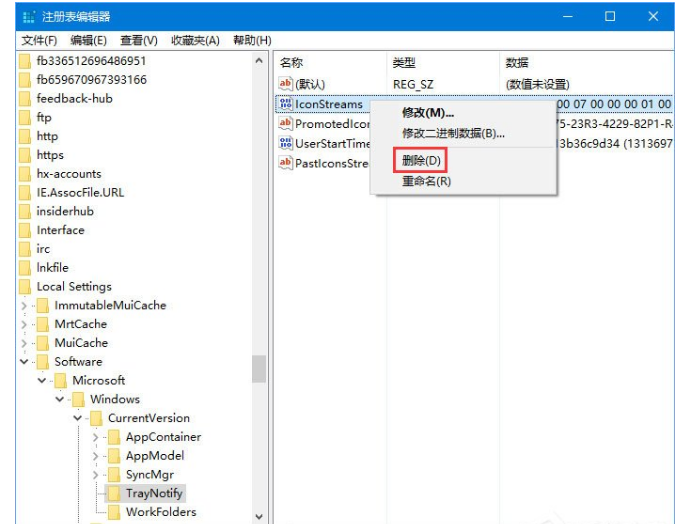 3、找到“IconStreams”和“PastIconsStream”這兩個鍵值并刪除,然后重啟電腦。