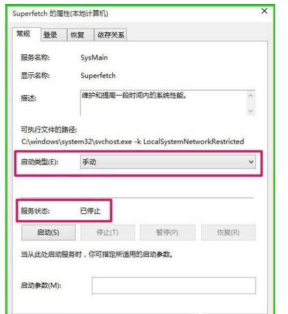 3、在打開的superfetch屬性對話框,我們可以看到superfetch的啟動類型為:手動,服務狀態為:已停止;