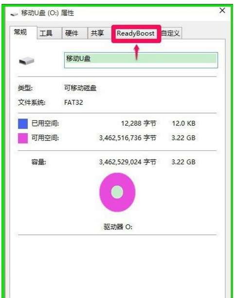 2、在U盤屬性對話框中點擊“ReadyBoost”;