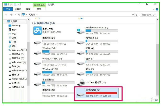 6、ReadyBoost配置緩存完成后,在資源管理器窗口可以看到U盤的空間全部被占用,電腦開機自動啟動ReadyBoost設置成功。(注意:U盤不能再用于存儲文件,U盤成為了電腦的一個輔助硬件。)