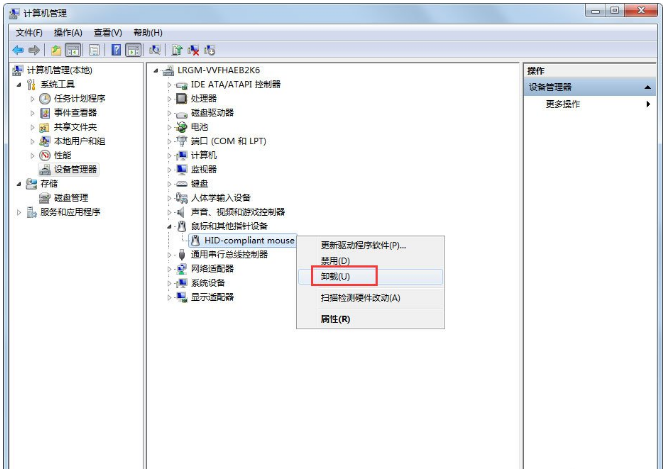 3、展開鼠標和其他指針設(shè)備,選擇卸載下面的“HID-compliant mouse”;