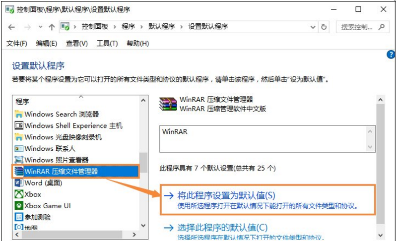 4、在左側(cè)找到壓縮軟件后選中TA,然后點(diǎn)擊右側(cè)的“將此程序設(shè)置為默認(rèn)值”。