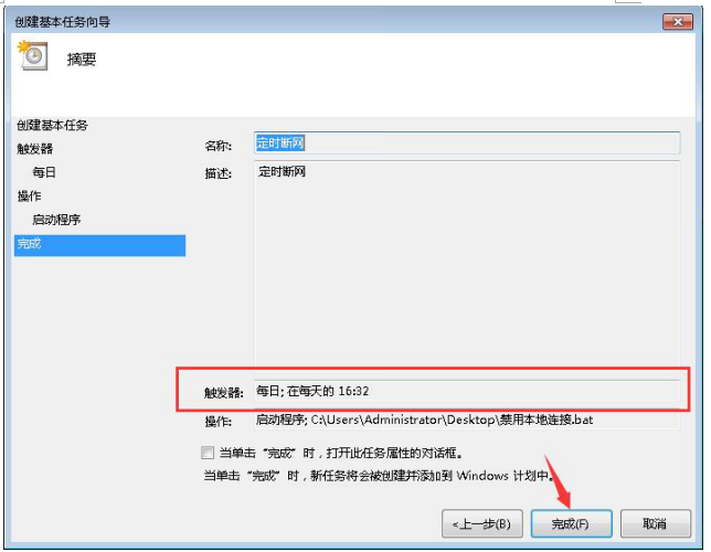 9、點擊完成后電腦定時斷網就設置完成了,這個原理就是設置在特定時間運行禁用本地連接腳本,禁用掉本地連接后就不能連上網了。