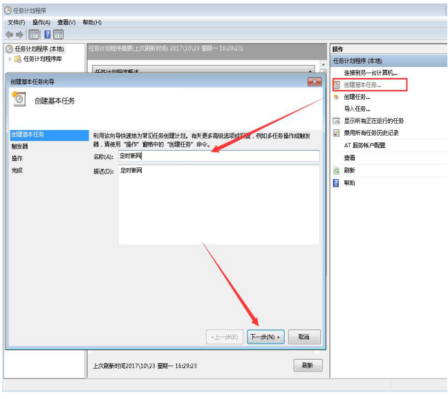 3、在打開的任務計劃程序內點擊“創建基本任務” 輸入名稱,點擊下一步。