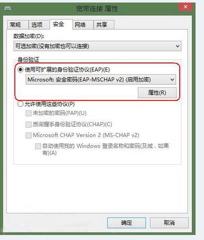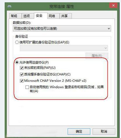 2、在打開的寬帶連接屬性設置窗口中,點擊“安全”選項卡,然后選擇身份驗證下的“允許使用這些協(xié)議”選項,將下方的三個選項全部勾選上,最后點擊“確定”保存設置即可。如下圖所示: