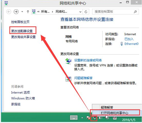 1、在任務欄的“網(wǎng)絡”圖標上點擊鼠標右鍵選擇“打開網(wǎng)絡和共享中心”,再點擊“更改適配器設置”,然后找到“寬帶連接”點擊鼠標右鍵選擇“屬性”。如下圖所示:
