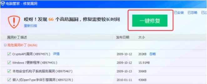 點擊后,它會掃描系統上存在的漏洞,掃描完,直接點擊‘一鍵修復’就可以了。