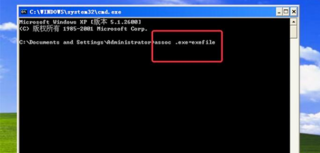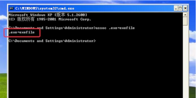 4、按了回車鍵后,窗口上有輸出.exe=exefile,則成功把關聯(lián)文件修復好了。現(xiàn)在exe文件就能打開了。