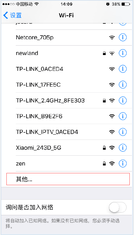 打開蘋果設備的WiFi連接列表,然后把列表拉到最底下: