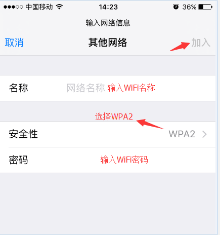 名稱的地方輸入WiFi名稱,加密方式要選擇WPA2的方式,密碼輸入WiFi密碼,點“加入”就開始連接WiFi了。