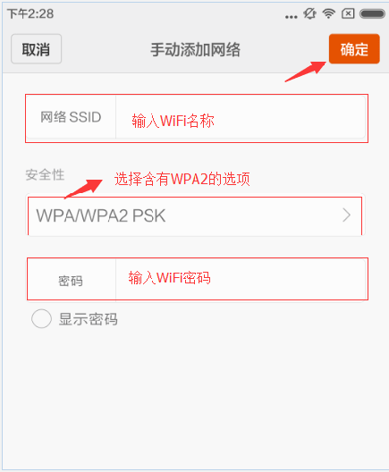 SSID的地方輸入WiFi名稱,加密方式要選擇WPA/WPA2的方式,密碼輸入WiFi密碼,點確定就開始連接WiFi了。