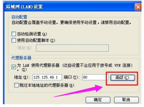 5、經(jīng)過(guò)以上設(shè)置之后,基本上可以隱藏自己的ip了,但是我們登陸一些比較高級(jí)的網(wǎng)站時(shí)或者別人使用比較厲害的軟件測(cè)試的時(shí)候,可能還是能查出我們的ip。所以,為了徹底隱藏我們的ip,還可以同時(shí)設(shè)置:在“局域網(wǎng)設(shè)置”對(duì)話框之中,點(diǎn)擊“高級(jí)”按鈕,