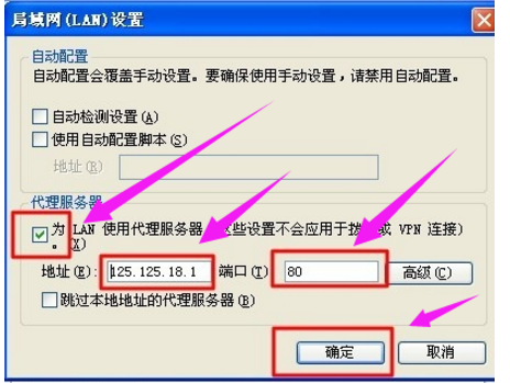 4、在“局域網(wǎng)設(shè)置”對(duì)話框之中,在“為L(zhǎng)AN使用代理服務(wù)器(這些設(shè)置不會(huì)應(yīng)用于撥號(hào)或 vpn鏈接)”之前打上√。然后在地址和端口這里填寫你準(zhǔn)備好的信息即可,