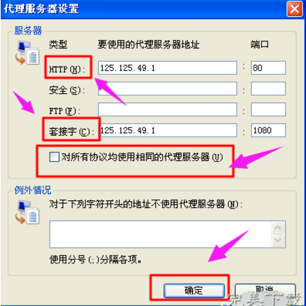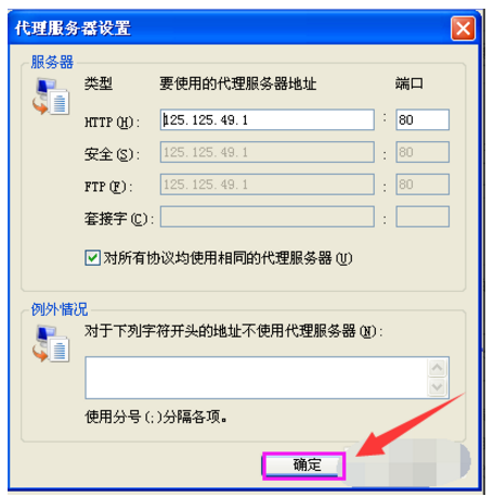 7、在“代理服務(wù)器設(shè)置”對(duì)話框中,取消“對(duì)所有協(xié)議均使用相同的代理服務(wù)器”前面的√。然后,在HTTP方框和套接字對(duì)話框之中填上不同的ip地址和端口,如此只要你一鏈接互聯(lián)網(wǎng),就不會(huì)顯示你真實(shí)的ip了。在百度搜索框之中輸入“ip”兩個(gè)字,看看是不是已經(jīng)變化成你剛剛設(shè)置的代理ip了。ok大功告成。