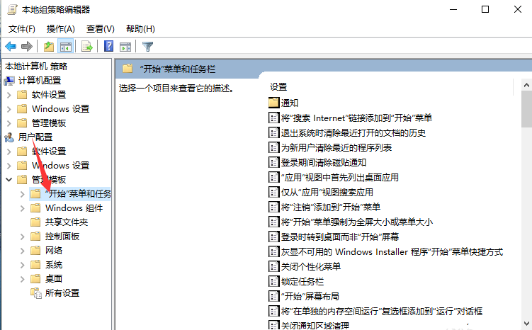 3、在本地組策略編輯器窗口的左側小窗口中,依次展開“用戶配置-->管理模版-->開始菜單和任務欄”選項。如圖所示;