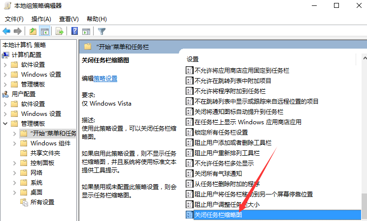 4、在“開始菜單和任務欄”選項右側窗口,找到“關閉任務欄縮略圖”選項選中并雙擊鼠標左鍵將其打開。如圖所示;