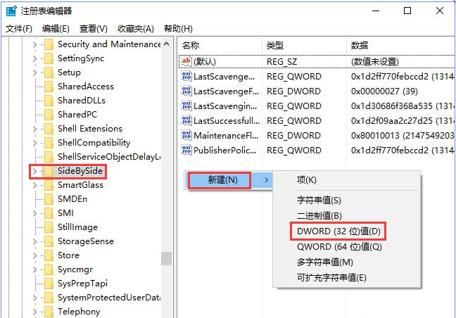 2、在注冊表左側依次展開:HKEY_LOCAL_MACHINE/SOFTWARE/Microsoft/Windows/CurrentVersion/SideBySide,在右側單擊右鍵點擊【新建】-【DWORD(32位)值】,將改制命名為【 PreferExternalManifest】;