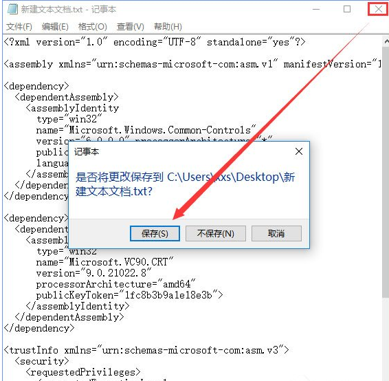5、關閉新建文本文檔,在彈出的款中點擊保存;