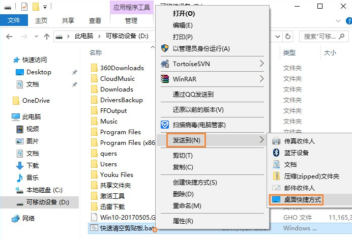 3、在D盤的“快速清空剪貼板.bat.”上右擊,選擇:發送到-桌面快捷方式。