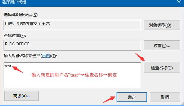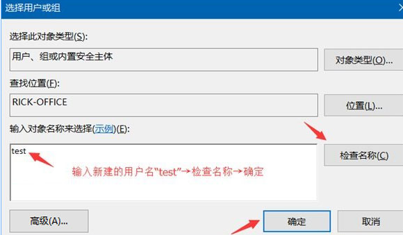 5、輸入新建的用戶名“test”→檢查名稱→確定;