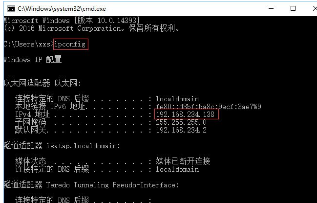 12、運行CMD命令→輸入ipconfig→回車鍵→記下IPv4地址;