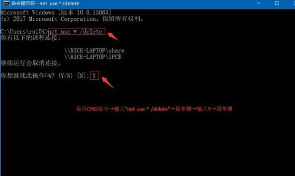 1、運行CMD命令→輸入“net use * /delete”→回車鍵→輸入Y→回車鍵;(此步驟只需首次操作)