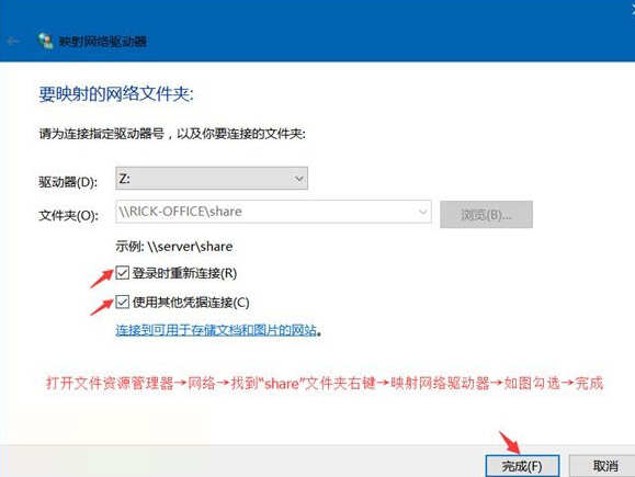 2、打開文件資源管理器→網(wǎng)絡(luò)→找到共享的“share”文件夾右鍵→映射網(wǎng)絡(luò)驅(qū)動器→如圖勾選→完成;