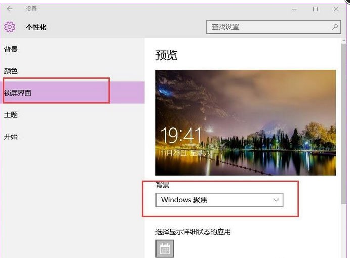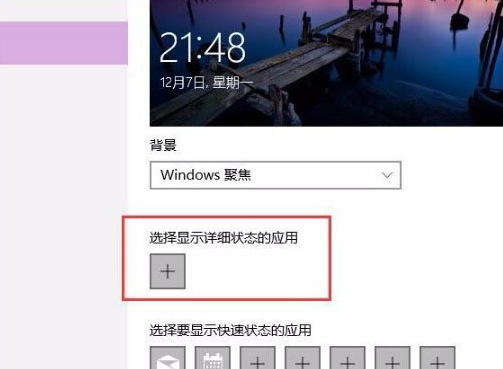 8、在Windows聚焦設置頁面中,點擊頁面中的“選擇詳細狀態的應用”設置項目,然后選擇需要顯示的應用,點擊頁面中的“+”按鈕。