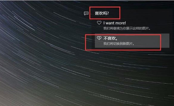 7、當我們點擊“喜歡嗎”的信息提示框之后,在彈出的菜單中有兩種選項可以供我們選擇,如果點擊“不喜歡”按鈕之后,系統將自動為我們切換到一張新的壁紙。