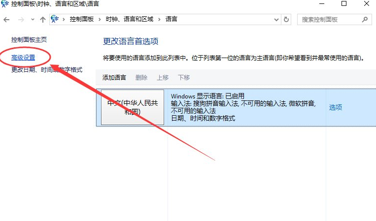4、在跳轉(zhuǎn)的“語言”對話窗口中,找到左側(cè)的“高級設(shè)置”選項(xiàng)并點(diǎn)擊它。如圖所示: