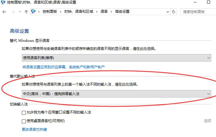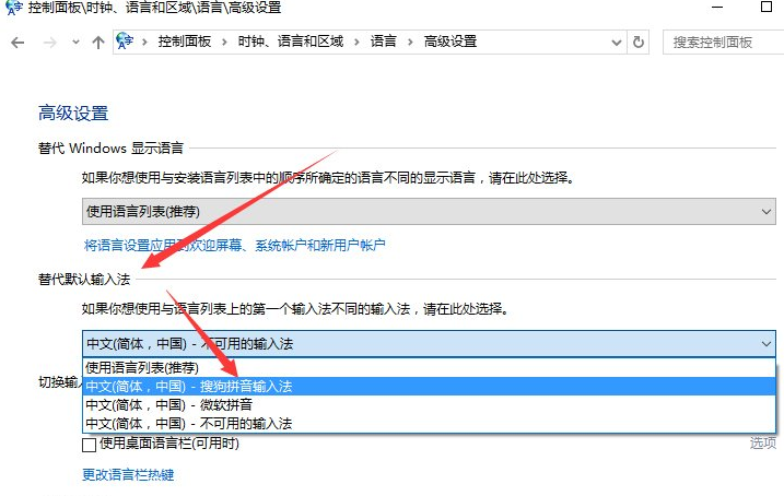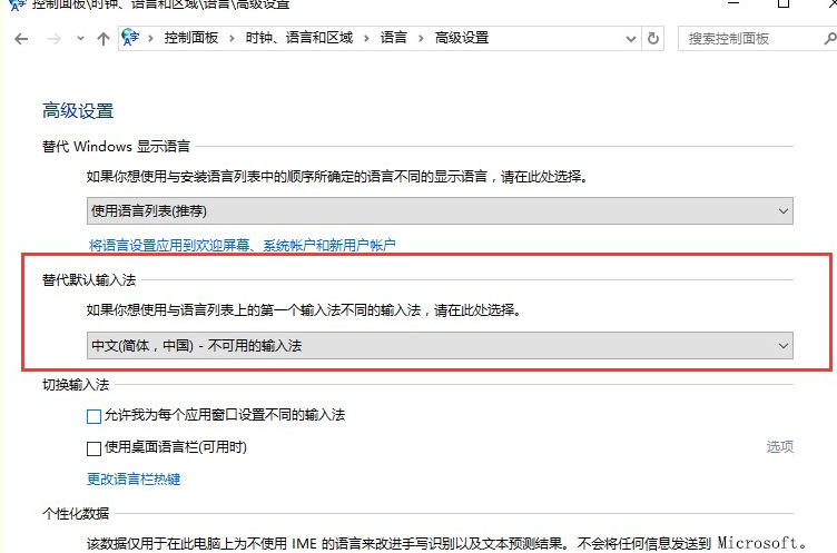 5、在高級設(shè)置對話窗口中,找到“替代默認(rèn)輸入法”項(xiàng),默認(rèn)是“中文(簡體,中國)-不可用的輸入法”。如圖所示: