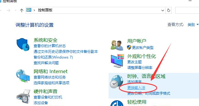 3、在打開的“控制面板”對話窗口中,找到“時鐘、語言和區(qū)域”下的“更換輸入法”選項(xiàng)并點(diǎn)擊它(輸入法軟件下載地址:http://m.survivalescaperooms.com/heji/pinyinshurufa/)。如圖所示: