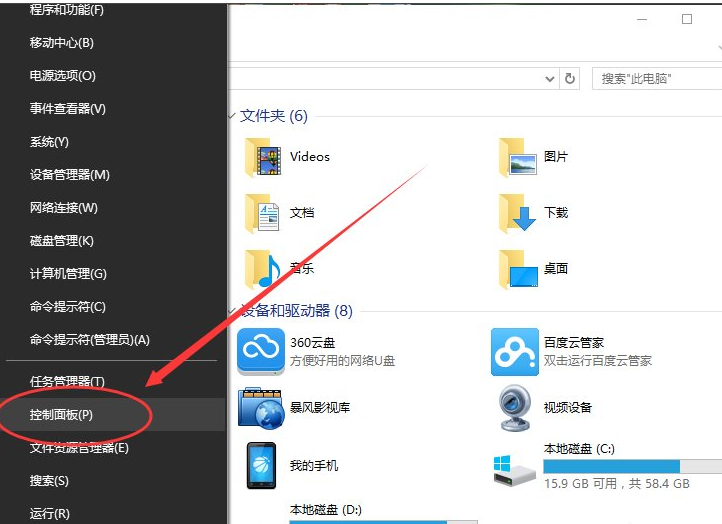 1、在Win10系統(tǒng)下,鼠標(biāo)右鍵點(diǎn)擊“開始”圖標(biāo)按鈕,在彈出的菜單選項(xiàng)框中找到“控制面板”選項(xiàng)并點(diǎn)擊它。如圖所示:
