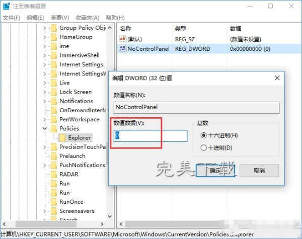 2、如果你是使用注冊表編輯器來禁用設(shè)置和控制面板的,要恢復(fù)原樣,你需要進(jìn)入注冊表編輯器,來到以下目錄:/HKEY_CURRENT_USER/Software/Microsoft/Windows/CurrentVersion/Policies/Explorer/,在窗口的右側(cè)找到名為NoControlPanel的DWORD(32位)值,雙擊它,將數(shù)值數(shù)據(jù)由1改成0,點(diǎn)擊確定按鈕。