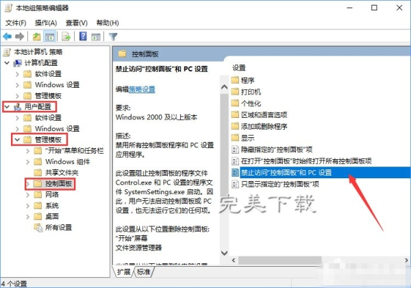 2、定位到:用戶配置-管理模板-控制面板,在窗口的右側(cè)找到并雙擊禁止訪問“控制面板”和PC設(shè)置