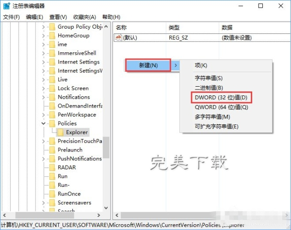 2、定位到:/HKEY_CURRENT_USER/Software/Microsoft/Windows/CurrentVersion/Policies/Explorer/,在窗口右側(cè)的空白處單擊鼠標(biāo)右鍵,選擇新建-DWORD(32位)值,并將此值命名為:NoControlPanel