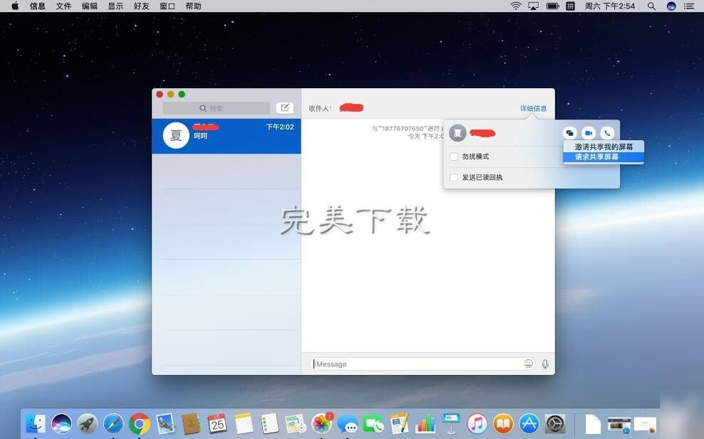 比如我與一個好友在用iMessage消息以后,可以點擊“詳細信息”選項,然后再點擊“屏幕共享”圖標,即可選擇是想遠程控制(遠程控制軟件下載地址:http://m.survivalescaperooms.com/heji/yuanchengkongzhiruanjian/)好友的Mac電腦,還是讓好友來操作我們自己的Mac電腦。