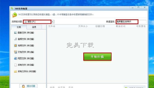 打開的對話框中,選擇你刪掉文件所在的驅動器,后面也可以輸入文件的名稱,點擊“開始掃描”