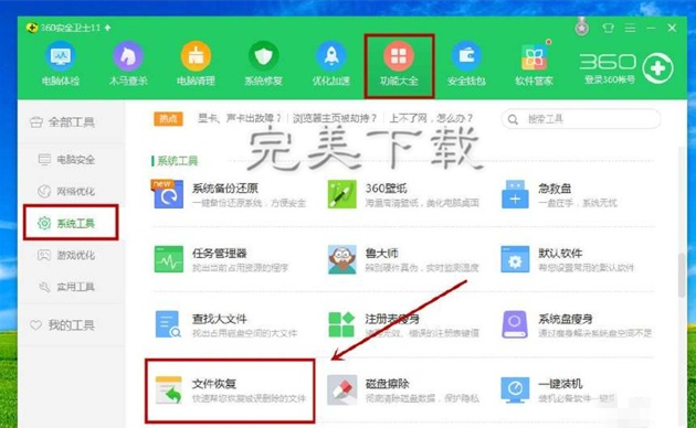 打開360安全衛士,選擇“功能大全”→“系統工具”→“文件恢復”