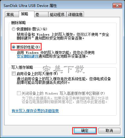 3、在U盤屬性窗口中,切換選項(xiàng)卡在“策略”上,點(diǎn)擊單選按鈕“更好的性能”,然后點(diǎn)擊確定按鈕,如圖: