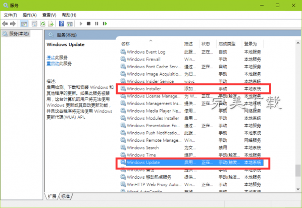 3、在打開的服務中,找到windows update和windows installer,查看啟動狀態(tài),如果么有啟動,就將其啟動即可。