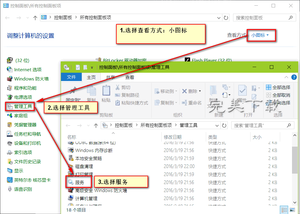 2、打開控制面板之后,找到服務選項,然后開始對服務進行調整,具體操作如下