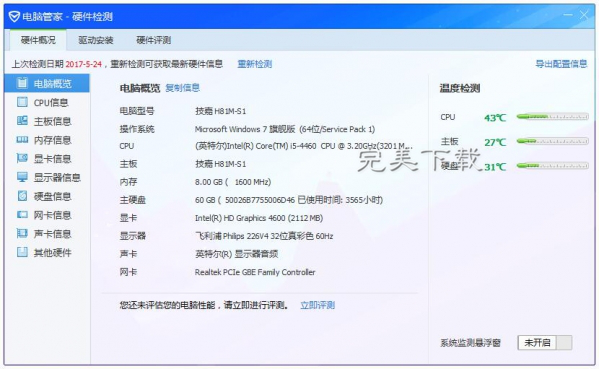 2、進入硬件檢測,會自動檢測出各個電腦配置信息,一覽無余!