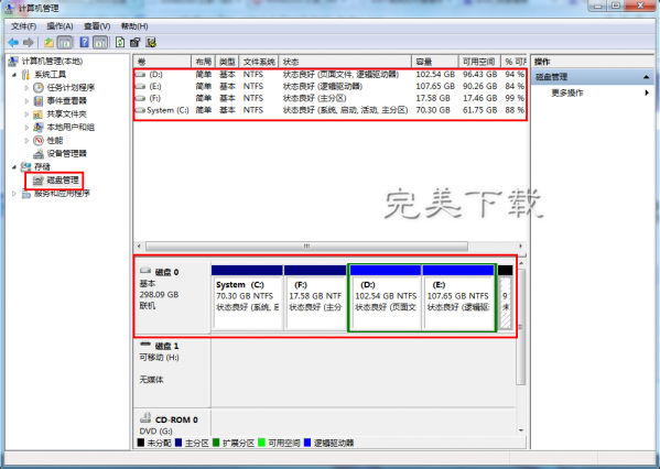 4、選中計算機→鼠標右鍵→在右鍵菜單欄選擇“管理”→在打開的計算機管理界面左側樹型圖中選擇“磁盤管理”,在界面右邊出現的各個磁盤進行點選,就可以查看各個磁盤容量大小及分配情況(下載磁盤清理工具,訪問http://m.survivalescaperooms.com/heji/cipanqingli/);