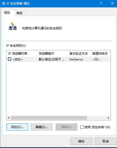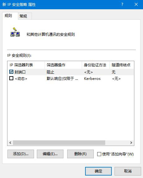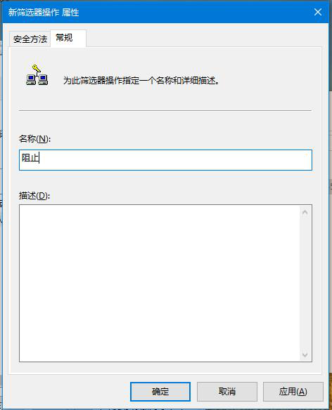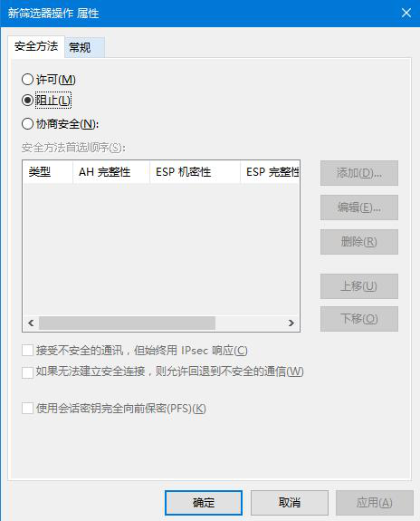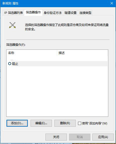 去掉“使用 添加向導”前面的勾,單擊“添加”按鈕,在彈出“篩選器操作屬性”中,“安全方法”選項卡,選擇“阻止”選項;